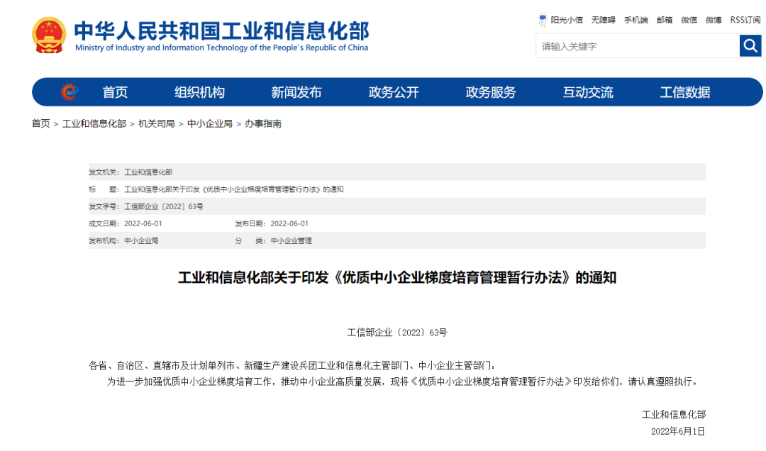 工业和信息化部门印发《优质中小企业梯度培育管理暂行办法》的通知。“专精特新中小企业认定标准”和“专精特新‘小巨人’认定标准”中含有15分“特色指标”,团体标准列入专精特新中小企业认定标准加分项。